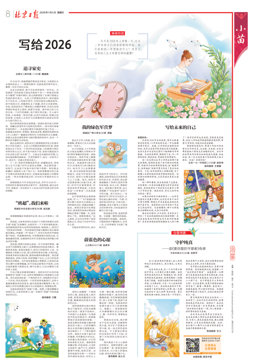 《小苗》版是《北京日报》上一个专属于孩子们的创作天地!在这里,孩子们可以书写自己成长的故事,展开想象的翅膀,也可以对城市建设提出建议。每周,《小苗》都会在《北京日报》与孩子们准时见面。在这里,孩子们能够正常的看到自己一点点长大的足迹。