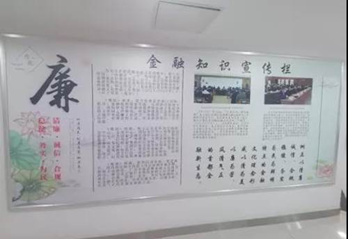 经过在职场走廊悬挂清凉金融文明建造、党建等宣扬展板,向公司全员进行介绍和宣扬,进步全员思想认识和醒悟,提示各层级职工廉洁自律,遵纪守法。